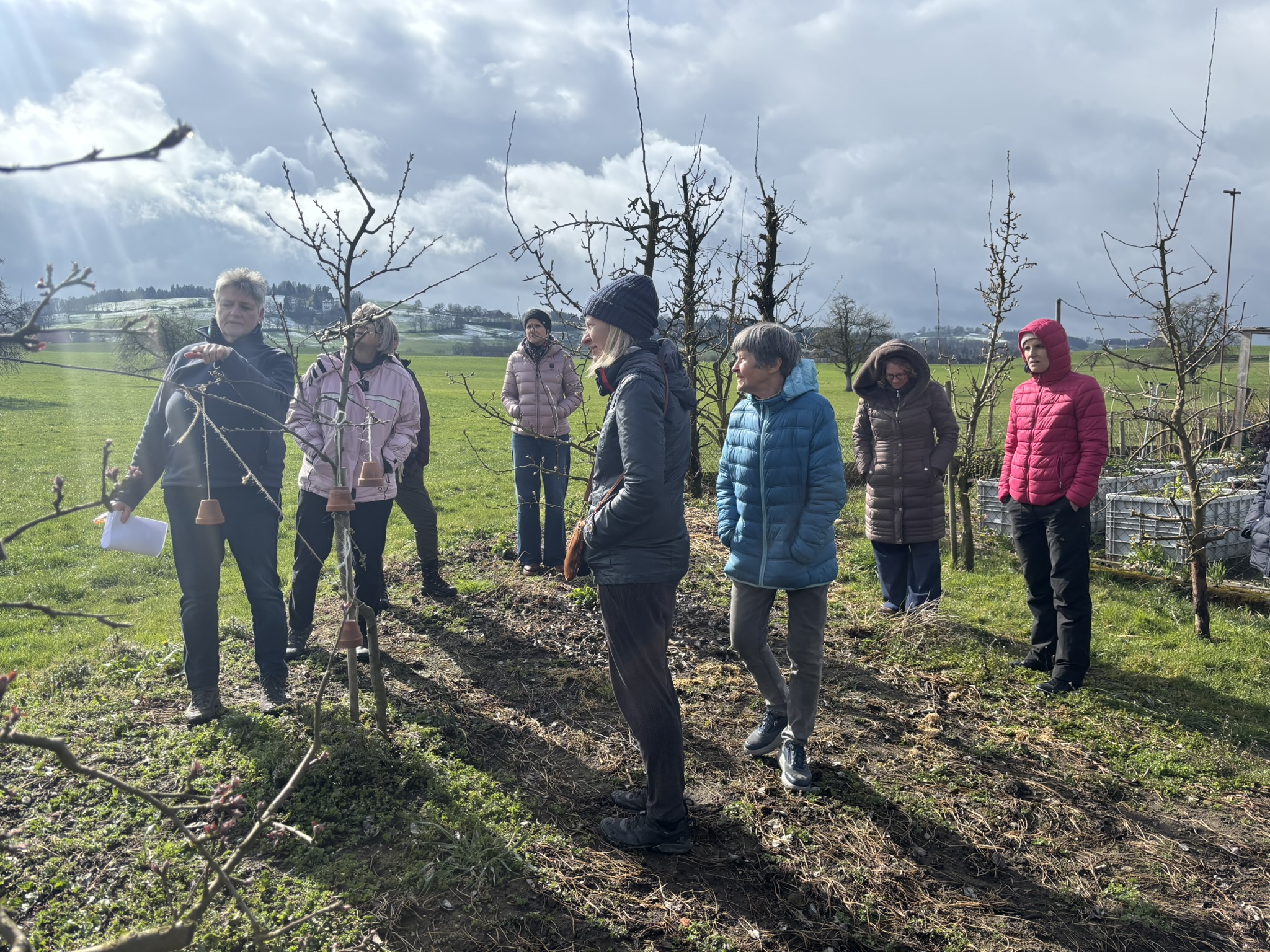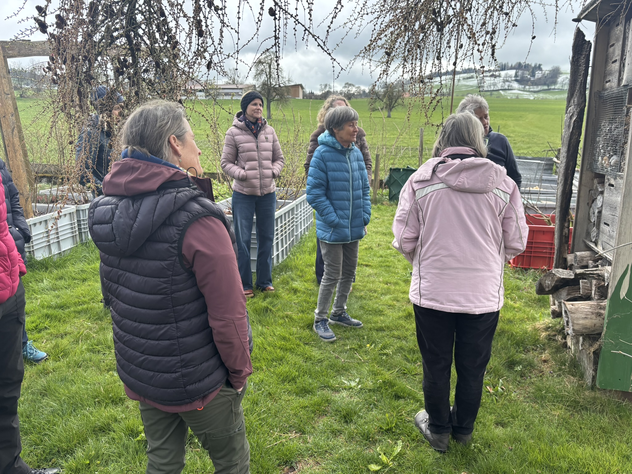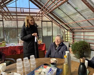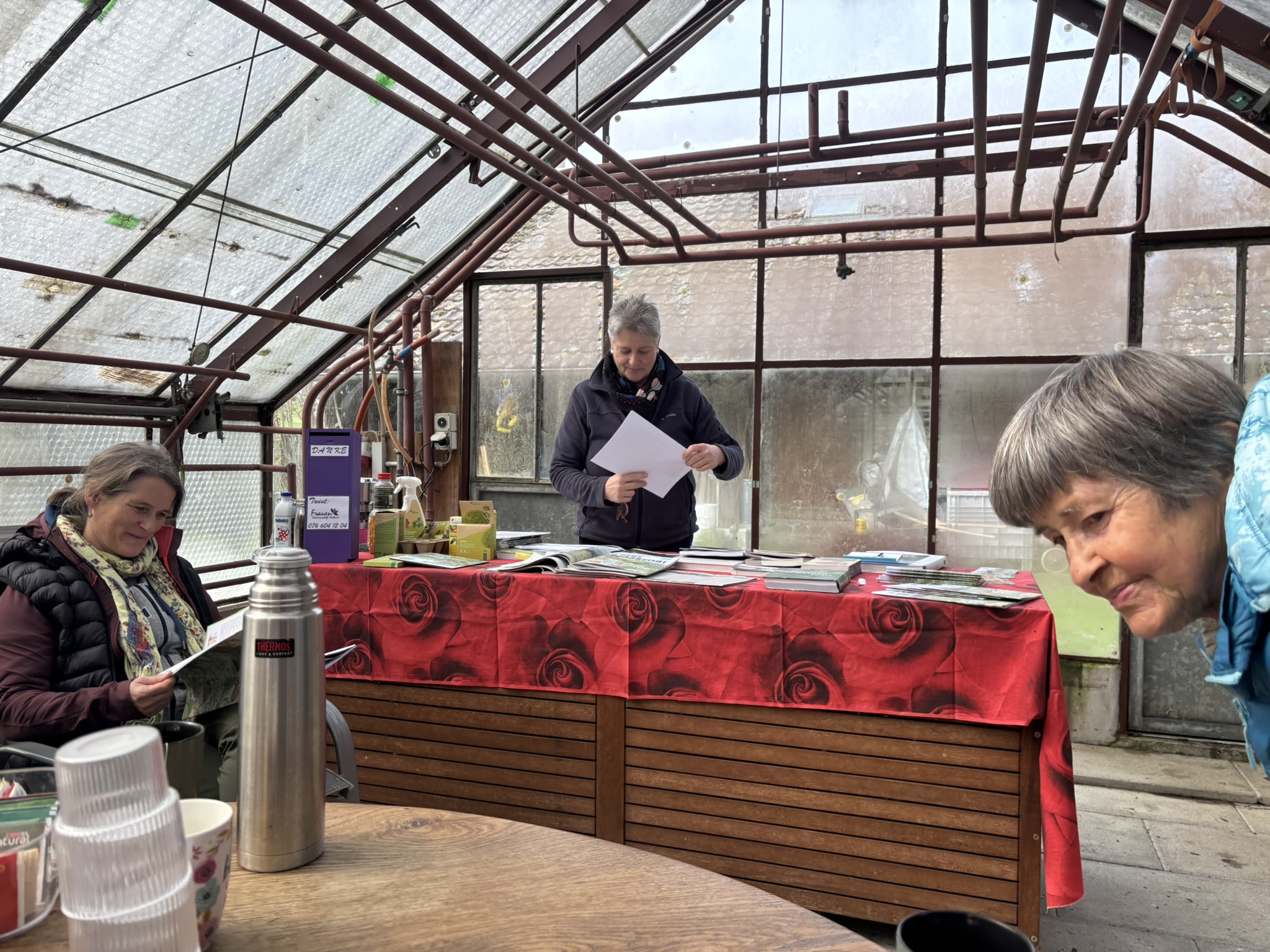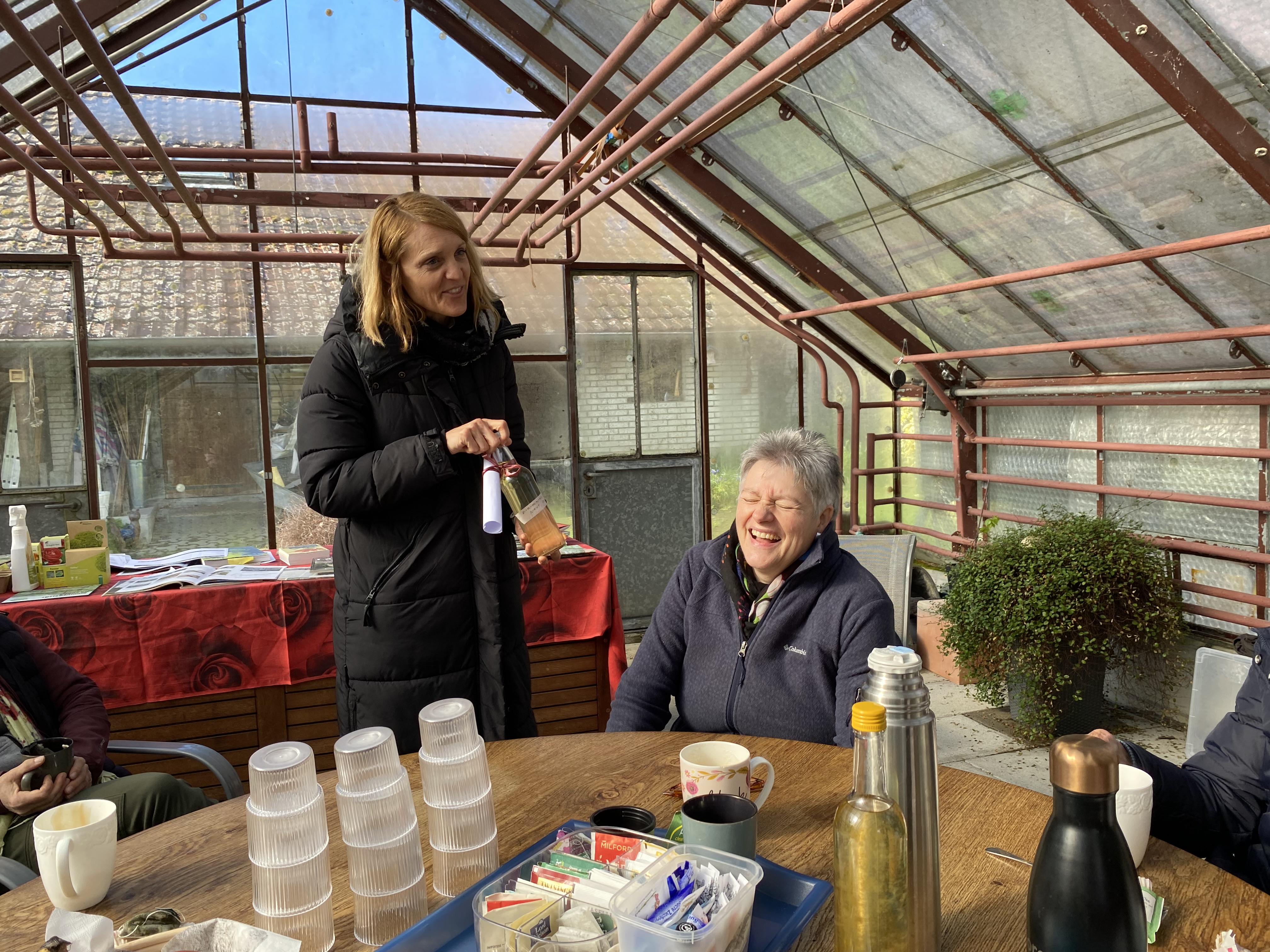 Gemeinsam durften wir bei Schnee draussen den Kaffee und Muffins im grossen Treibhaus von Gartencoach Barbara Vogel geniessen